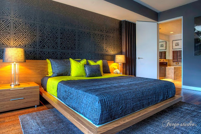 Общность дизайна интерьера продолжают и остальные комнаты. Но стоит отметить, как умело разбавлена яркими акцентами все та же сдержанная, темная палитра в лаунж- зоне. В спальне характерная гамма приукрашена деталями цвета лайм в виде подушек и кресла, а также, отличной от гостиной, текстурой дерева.